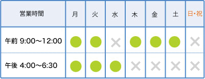 休診日 : 水曜午前、木・金・土曜午後、日曜、祝日